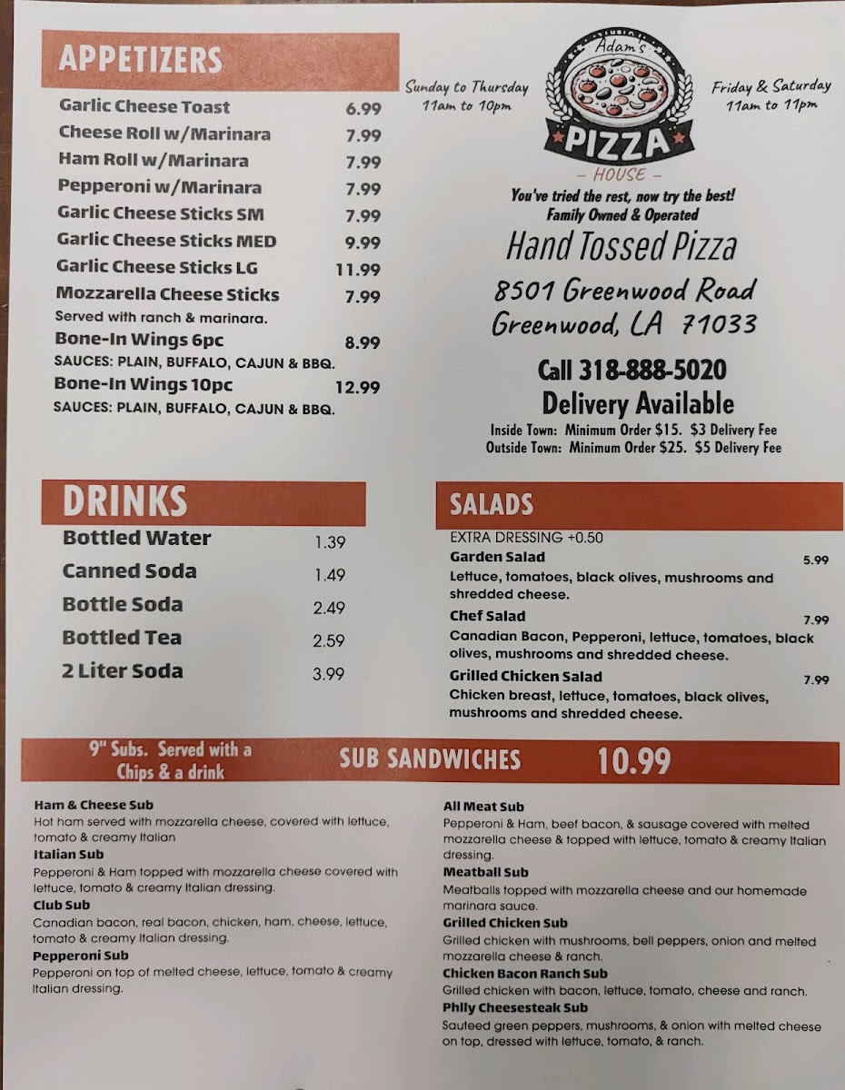Welcome to Adam’s Pizza House, your new favorite destination for mouthwatering pizza and comforting eats in Greenwood, LA. Nestled at 8501 Greenwood Rd, this pizzeria is home to a variety of specialty pizzas and innovative subs that tantalize the taste buds. Their signature specials like the #3 Adam's Special, featuring two large specialty pizzas for just $34.99, offer fantastic value while showcasing flavor.